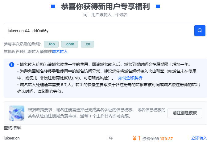 1、去阿里云申请域名转出,得到转出秘钥,然后再火山引擎中填写域名+密钥,可以看到转入价格为38-37=1元。