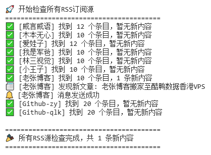 经过Deepseek的不断完善,终于得到了理想的效果,脚本可以按时检查各订阅源,并将最新一篇文章ID写入SQLite数据库,当检查发现有新文章时,会使用微信机器人进行消息推送。